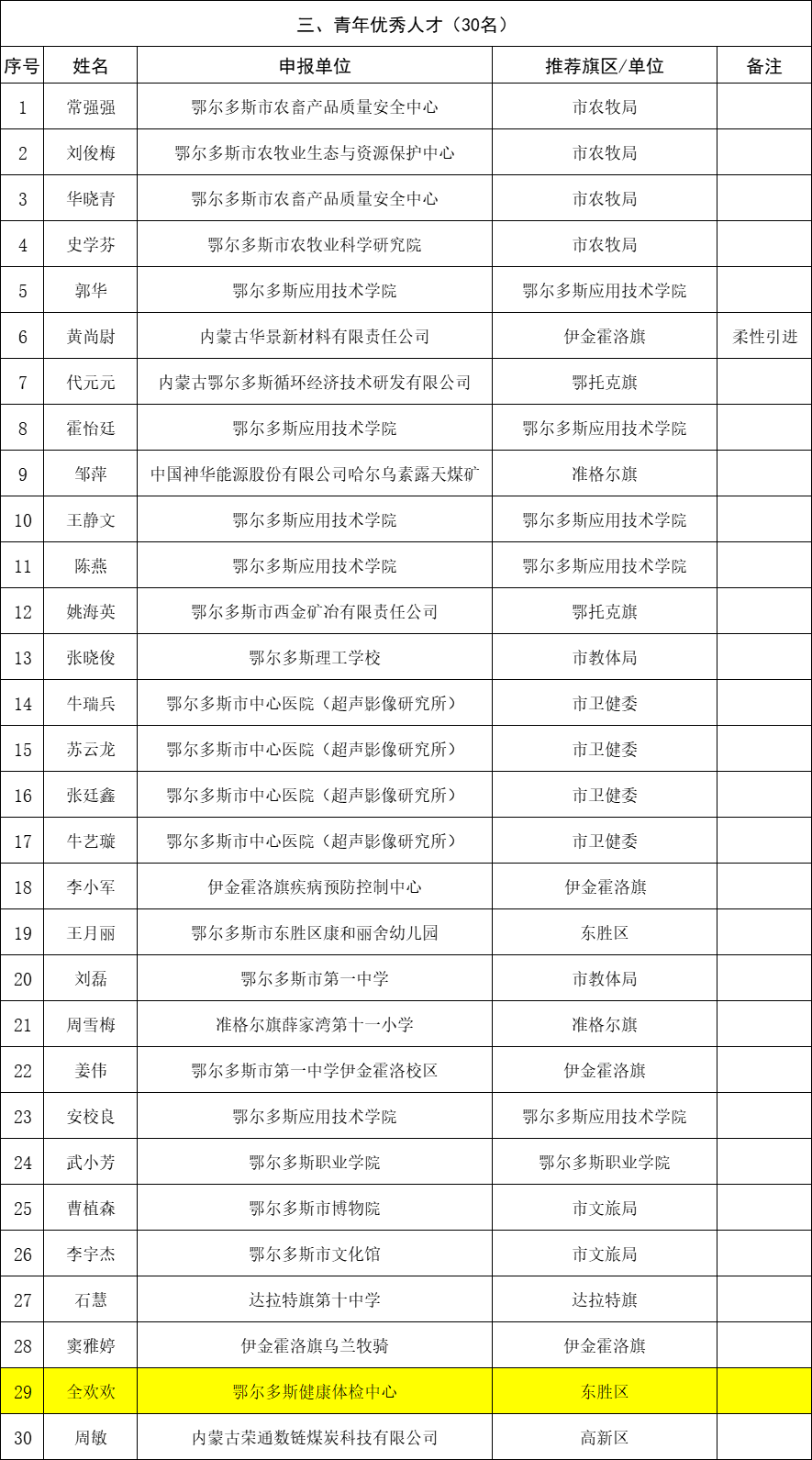 近日,2023年度鄂尔多斯市高层次人才评选结果公示,新评选市级高层次人才77名,其中,鄂尔多斯健康体检中心院长全欢欢获评“2023年度鄂尔多斯市高层次人才”称号!在鄂尔多斯健康体检中心强化人才战略之际,全欢欢同志作为体检中心青年人才代表,获评“青年优秀人才”殊荣,是对其个人与鄂尔多斯健康体检中心人才建设的充分肯定与激励。鄂尔多斯健康体检中心将始终坚持以人才为中心,把人才当做第一资源,为医疗机构的转型升级发展提供持续动力。